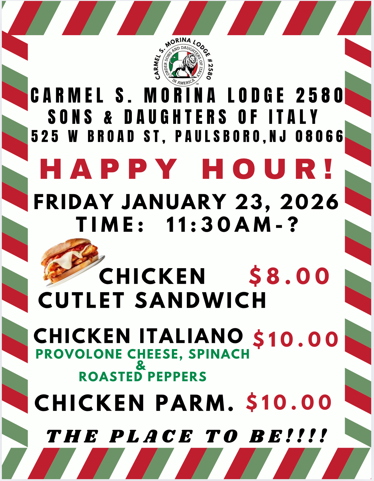 | Friday, January 23rd 2026 | 11:30-7pm | Chicken Cutlet Happy Hour |